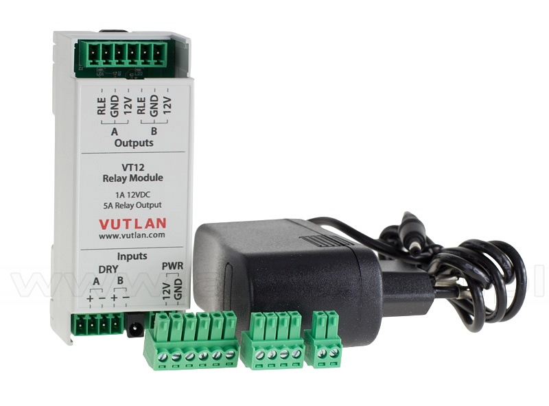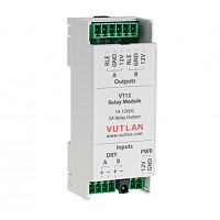 VT12 Relay Module is a dual-channel switching unit designed to turn on/off loads. It can be connected to the dry contacts outputs of VT855 and VT336 Vutlan monitoring units to turn on/off loads with current up to 1A, when the device's Dry contact output is triggered.