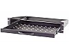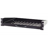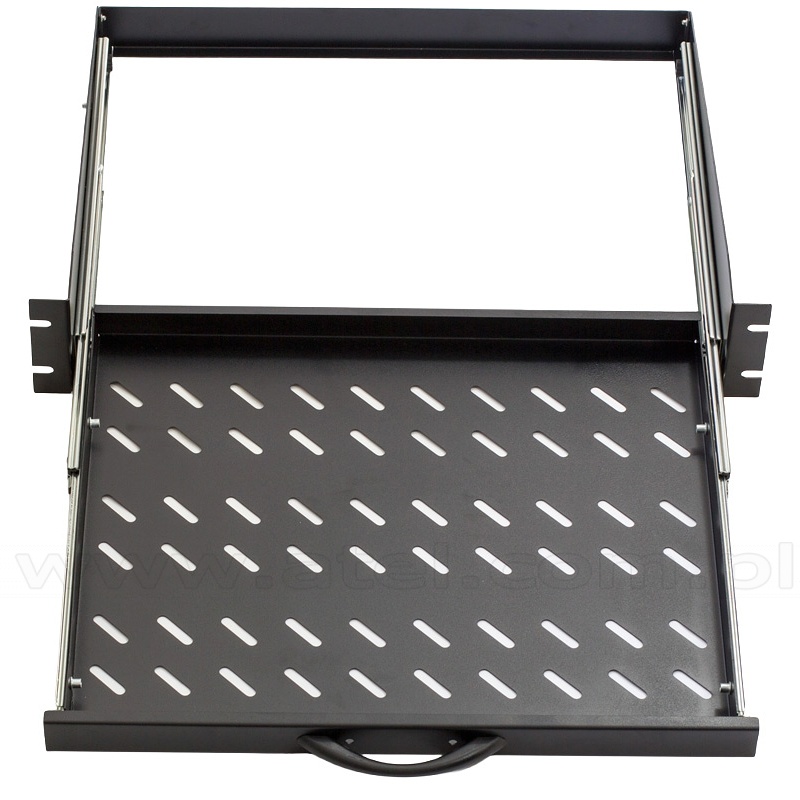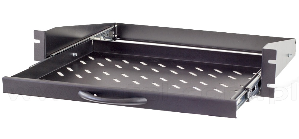 Reinforced, attached to the front and rear bars shelf meant for telecommunication cabinets with 19" rack bars spacing and 600mm depth. Allows for placing rather heavy equipment without mounting brackets in the cabinet.