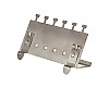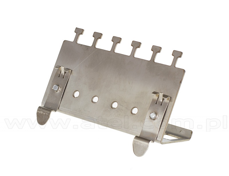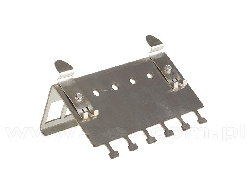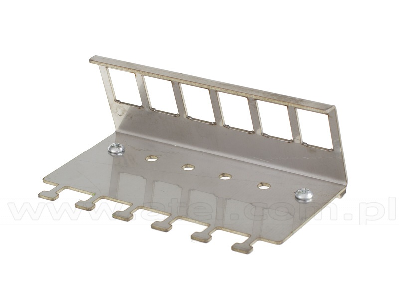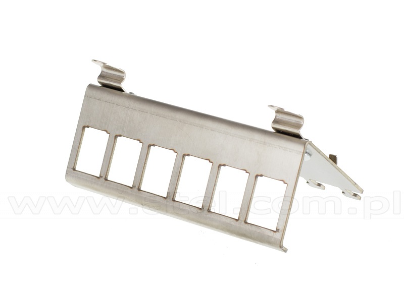Solid metal handle enabling mounting of six keystone ports on a DIN 35mm rail.