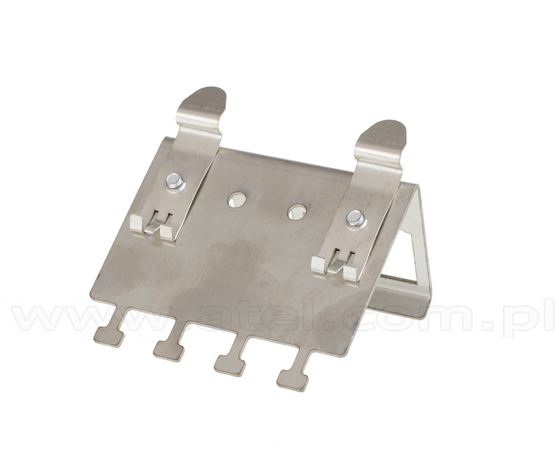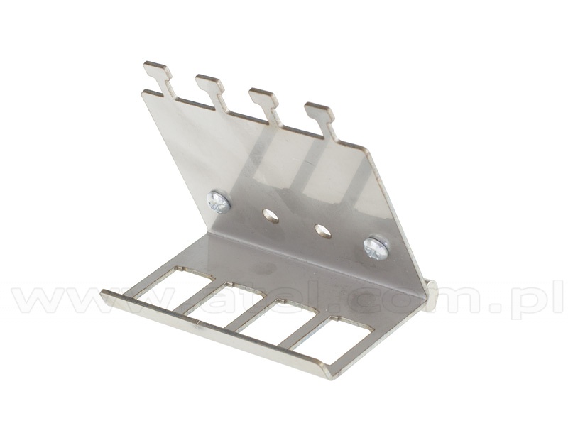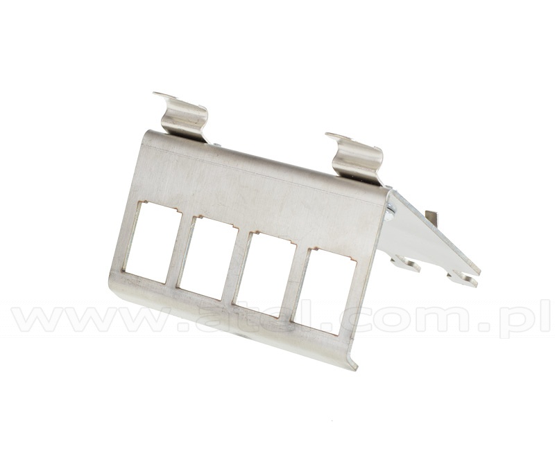 Solid metal handle enabling mounting of four keystone ports on a DIN 35mm rail.